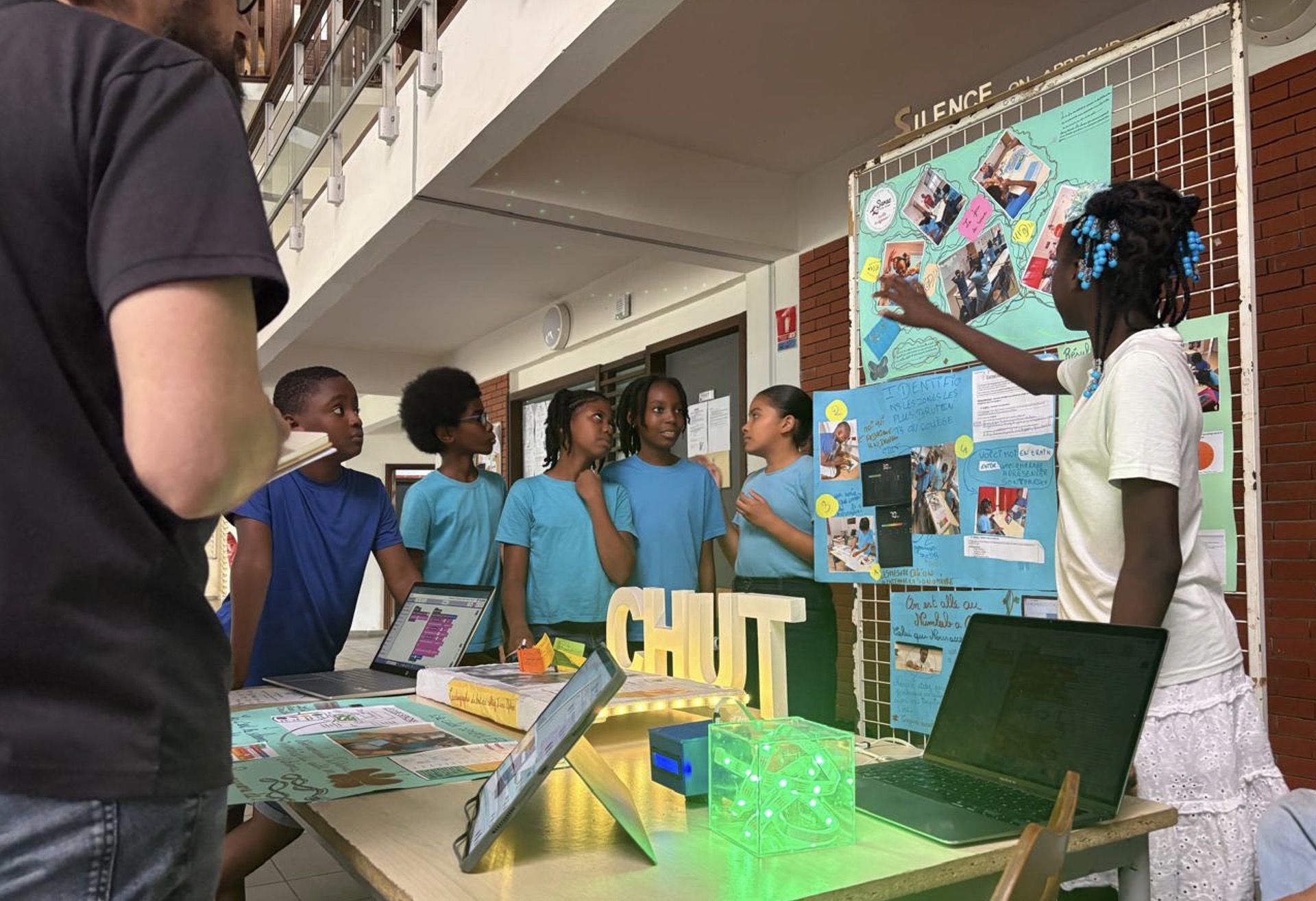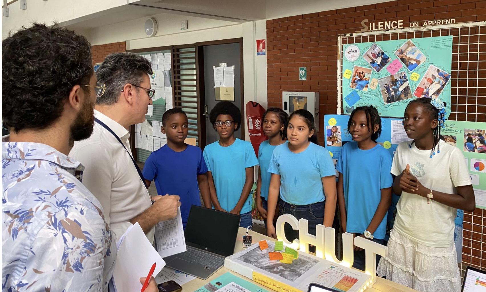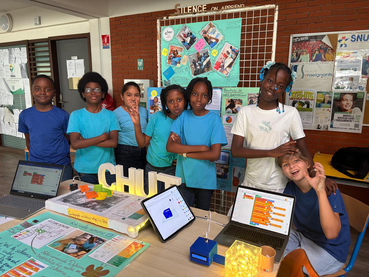 Cette année, dans le cadre du concours scientifique CGENIAL, les élèves de la 6e Roura et de la 6e Twenke ont mené une enquête scientifique au collège pour comprendre et analyser l’impact du bruit sur la vie quotidienne des élèves. Ils ont alors souhaité proposer une solution concrète afin de réguler le bruit dans les endroits du collège identifiés comme étant les plus bruyants.