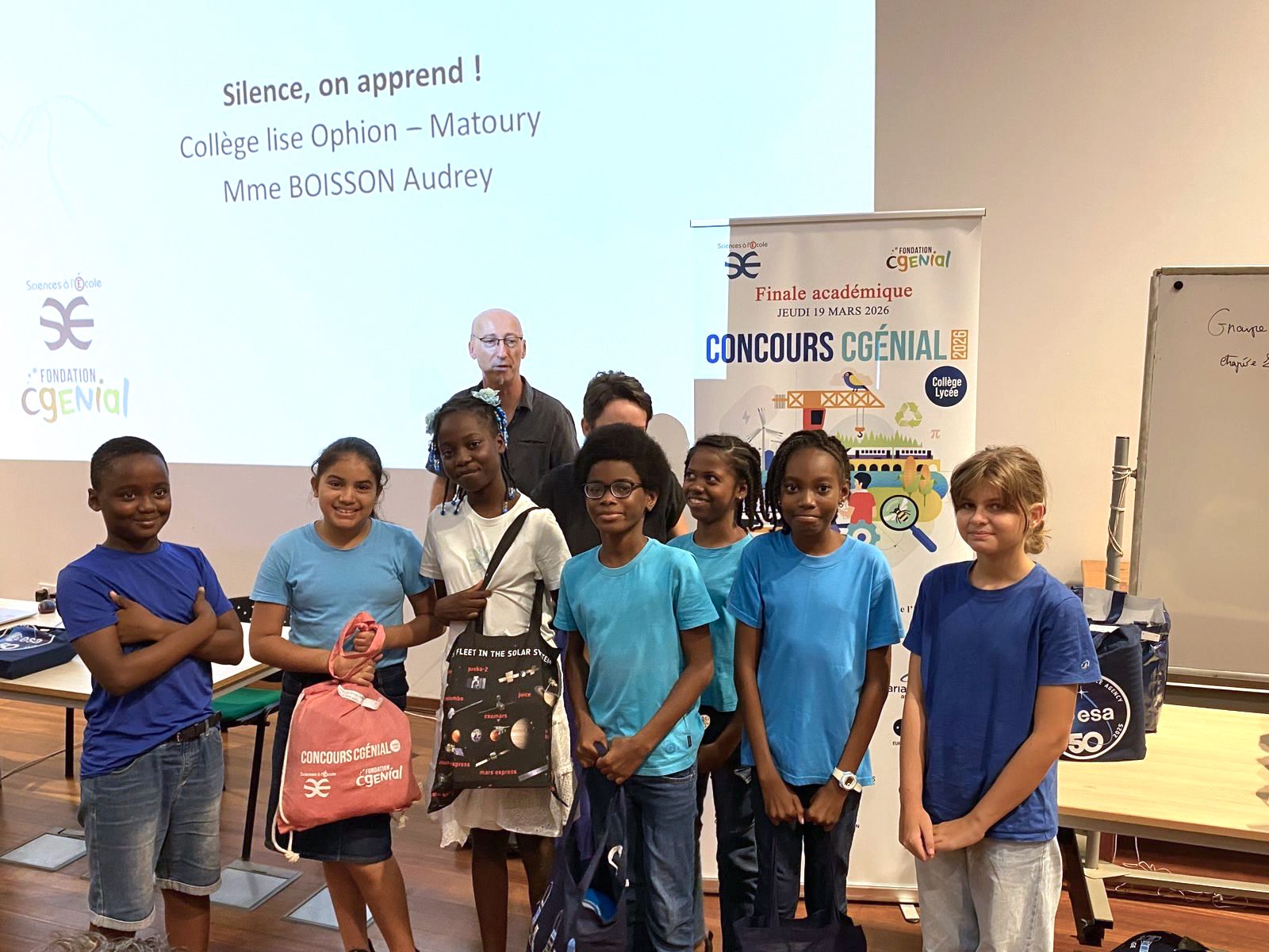 Keyvan’n, Fanny, Keiltia, Dahissa, Maxyme, Juleisy et Perla ont pu présenter leur projet oralement à la 13e Edition du concours CGENIAL Guyane, le 19 mars 2026 à l’INSPE de l’Université de Guyane, afin de convaincre les jurys de l’originalité de leur projet et de la qualité de la démarche scientifique utilisée.